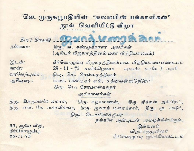 குறிப்பிட்ட நிகழ்ச்சியின் அழைப்பிதழை இன்றளவும் பாதுகாத்து வைத்திருக்கும் புத்தளத்தில் வதியும் எழுத்தாளர் ஜவாத் மரைக்கார், சமீபத்தில் அதனை தமது முகநூலில் பதிவேற்றியிருந்ததாக பல நண்பர்கள் தெரிவித்து, அந்த இணைப்பினை எனக்கு அனுப்பியிருந்தார்கள்.