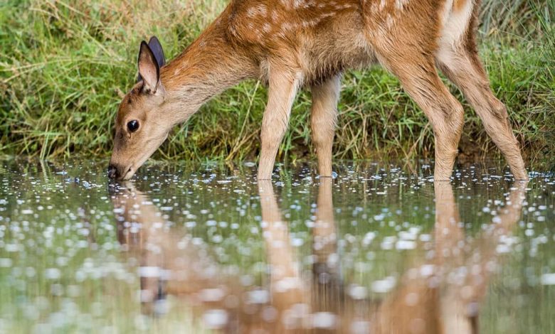 நீர் நிரம்பியிருந்த குளத்தைக் கண்டதும் கரையை நாடிச் சென்று குனிந்து நீரின் மேற்பரப்பில் வாயை வைத்துப் பருகத் தொடங்கிற்று.