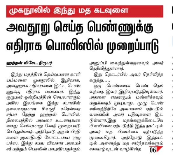 இந்த நிலையில் சிலபத்தைச் சேர்ந்த ஒருவர் இந்து மக்களை கவலை கொள்ளவும் கோபப்பட வைக்குமளவிற்கு பொறுப்பற்ற முறையில் அதுவும் அவர் ஒரு சட்டத்தரணியாக இருந்தும் இத்தகு பதிவுகளை அவர் வெளியிட்டமை தமிழ் மக்களிற்கும் சிங்கள மக்களுக்குமிடையில் இன முரண்பாட்டை தோற்றுவிக்கும் செயலாகவே பார்க்கப்படுகின்றது.