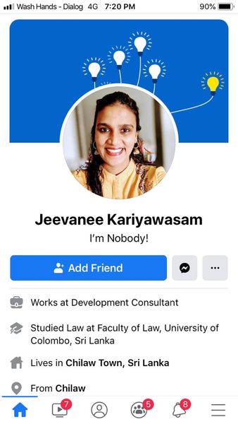 இவருடைய பதிவு முழு இலங்கையின் பண்பிற்கே கேடு விளைவித்துள்ளது என்பதை அவர் உணர்தல் வேண்டும்.அவர் தன்னளவில் நான் யாருமில்லை (I am nobody) என்று அவர் வெளிப்படுத்தலாம் விளிக்கலாம் அது அவரின் உரிமை ஆனால் நாங்கள் யாருமில்லை(We are nobody) என அவர் விளிக்க முயற்சிப்பது தவறேயாகும்
