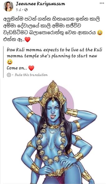 இலங்கை சிலாபத்தைச் சேர்ந்த சட்டத்தரணியான ஜீவாணி காரியவாசம் தனது முகநூலில் காளியம்மனை மேலாடை எதுவுமின்றியும் இடுப்பில் உள்ளாடை மட்டுமே அணிந்துள்ள நிலையில் மண்டை ஓடுகளை மாலையாகக் கொண்ட படமொன்றை பதிவிட்டதால் அது காளியை வழிபடும் இந்துக்களையே அவமதிக்கும் செயலாகவும் அவர்களைக் கோபமும் கவலையுமடையச் செய்துள்ளது.