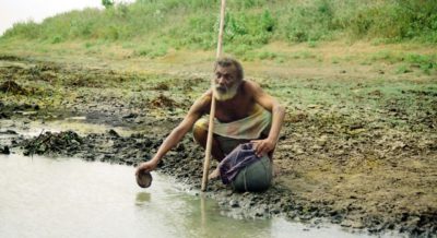 மேகங்கள் சூழ்கொண்டு வானமும் இருண்டு மழை பொழிகிறது. முதியவரின் முகம் புன்னகையுடன் பிரகாசிக்கிறது.