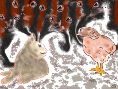 அயல்வீட்டில் செல்லப்பிராணியாக வளரும் பூனையுடன் கோழி சிநேகம் பூண்டது. அடிக்கடி பூனையுடன் பேசும்போது தான் வசிக்கும் வீட்டின் எலிகளின் அட்டகாசம் பற்றி புலம்பியது.
