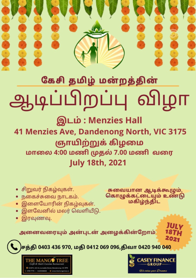பல மாதங்களாக ஒருவரையொருவர் பார்க்காமல் முடங்கியிருந்த உறவுகள் நண்பர்கள் ஒன்று கூடும் இனிய நன்நாளாக கேசி தமிழ் மன்றத்தின் ஆடிப்பிறப்பு விழா இம்முறை டாண்டினோங்கில் அமைந்துள்ள Menzies மண்டபத்தில் 18-07-2021 ஞாயிற்றுக்கிழமை பிற்பகல் 4.00க்கு சிறப்பான முறையில் (கோவிட் விதிகளுக்கு அமைய) நடைபெறுவதற்கு ஏற்பாடு செய்யப்பட்டுள்ளது.