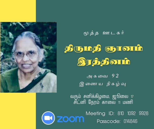 அத்துடன் நில்லாமல், தாமதிக்காமல் ஞானம் இரத்தினம் அம்மையாரின் வாழ்வும் பணிகளும் குறித்துப் பேசுவதற்கு இணையவழி காணொளி அரங்கிற்கும் ஏற்பாடு செய்துவிட்டார்.