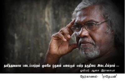 தேடல், ஆய்தல், கற்றல், அறிதல் என விரிந்து பரந்தளத்தில் அவர் ‘ஆத்மா’ வின் கலையார்வம் விஸ்வரூபம் கொள்ளத் தொடங்கியது. அந்த விஸ்வரூப வளர்ச்சி பிரமிக்கவைக்கும் வகையில் வளர்ந்து வந்து இவரை ஒரு மகா கலைஞனாக்கியுள்ளது.