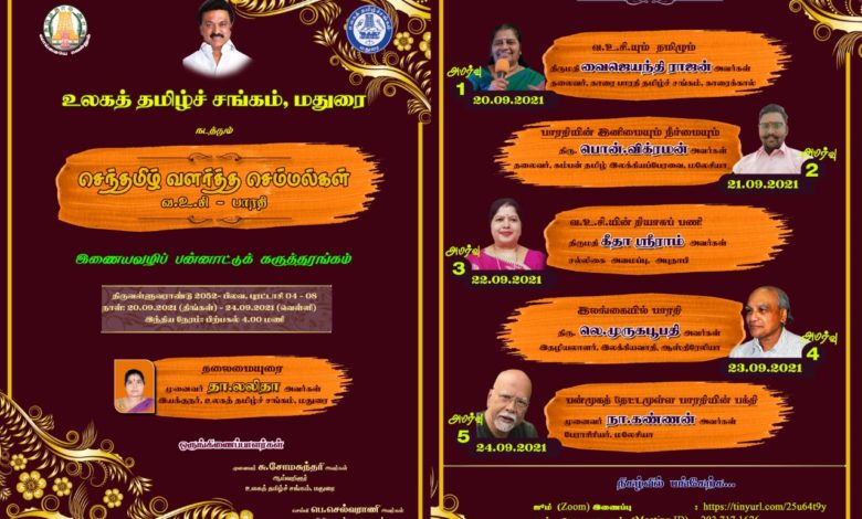 உலகத் தமிழ்ச் சங்கம் மதுரையின் சார்பில் ‘செந்தமிழ் வளர்த்த செம்மல்கள்-வ.உ.சி, பாரதி’ என்ற இணையவழிப் பன்னாட்டுக் கருத்தரங்கம் ( 20.09.2021 முதல் 24.09.2021 முடிய ) ஐந்து நாள்கள் இந்திய நேரம்: பிற்பகல் 4.00 மணிக்கு ஜூம் செயலி வழியே நடைபெறவுள்ளது. இக்கருத்தரங்கில் பங்கேற்க… பதிவுப்படிவம்