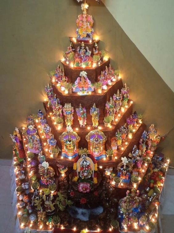 கொலு மேடையில் கீழிருந்து முதற் படியிலே – ஓரறிவான , புல் , செடி போன்ற வற்றையும் , இரண்டாம் படியில், ஈரறிவுடைய நத்தை, சங்கு போன்றவற்றையும், மூன்றாவது படியில், மூன்றறிவுடைய கறையான் , எறும்பு போன்றவற்றையும், நான்காம் படியில் நான்கறிவான நண்டு, வண்டு, போன்றவற்றின் பொம்மை களை யும், ஐந்தாம்படியில் ஐந்தறிவான மிருகங்கள், பறவைகளின் பொம்மைகளை வைத்தல் வேண்டும்.ஆறாவது படிதான் எங்களுக்கு உரியதாகும்.சிந்திக்கும் அறிவுடைய நிலை மனிதர்களுக்கே இருப்பதால் இந்தப் படியில் மனிதர்களின் பலவகைப் பொம்மைகள் இடம் பெற்றிருக்கும்.ஏழாவது படியானது – மனிதனாய் இருந்தும் உயர்நிலையினை எய்திய ரிஷிகளுக்கு உரியதாய் அமைகிறது.அங்கு ரிஷிகளின் பொம்மைகள் வைக்கப்படும். மனிதருக்கும் ரிஷிகளுக்கும் அப்பால் தேவர்கள் வருகிறார்கள்.எனவே எட்டாம் படியில் தேவர்கள் இடம் பெறுவார்கள். இதில் நவக்கிரகங்கள், அட்டதிக்கு பாலகர்கள், தேவைதைகளின் பொம்மைகள் வைக்கப்படும்.ஒன்பதாம் படிதான் கடவுளருக்கு உரிய இடமாகும்.பிரம்மா, விஷ்ணு, சிவன் ஆகிய முப்பெருந் தெய்வங்களும், ஸரஸ்வதி , லக்ஷ்மி, பார்வதி ஆகிய முப்பெருந் தேவியரும், இடம் பெறுவர். நடுநாயகமாய் ஆதிபராசக்தியின் பொம்மை வீற்றிருக்கும்.