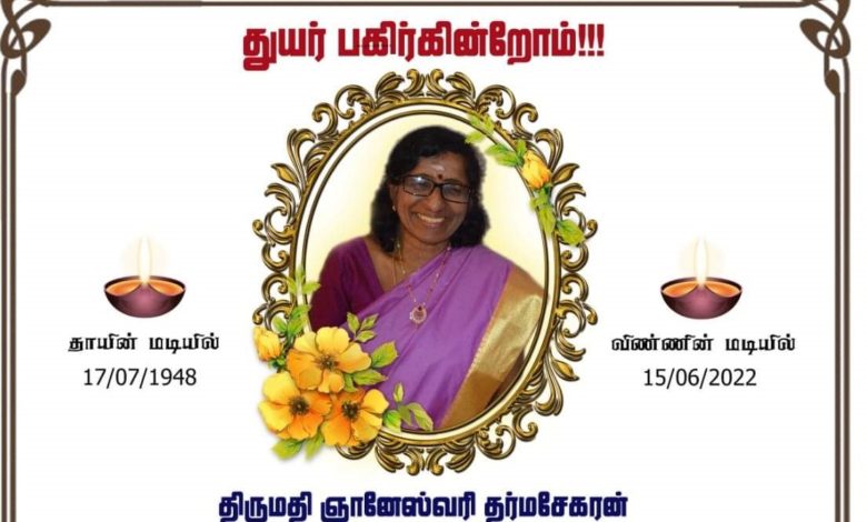 சங்கதிகள்மரண அறிவித்தல்…. திருமதி ஞானேஸ்வரி தர்மசேகரன்!June 17, 2022 மரண அறிவித்தல் திருமதி ஞானேஸ்வரி தர்மசேகரன் TagsFeatureJune 17, 2022 Facebook Twitter LinkedIn Messenger Messenger WhatsApp Viber