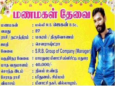 அதாவது மணமகள் தேவை என்று தனது புகைப்படத்துடன் விவரங்கள் அடங்கிய போஸ்டர்களை வீதி வீதியாக சுவர்களில் ஒட்டியுள்ளார். இவ்வாறாக அவர் மதுரை மாநகர், புறநகர் மற்றும் திண்டுக்கல் மாவட்டத்திலும் போஸ்டர்களை ஒட்டியுள்ளார். பி.எஸ்.சி பட்டதாரியான தாம் மாதம் 40 ஆயிரம் சம்பாதிப்பதாக அந்த போஸ்டரில் குறிப்பிட்டுள்ளார்.
