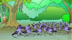 இதன் கதை அனைவருக்கும் தெரிந்ததுதான். ஒற்றுமையே பலம் என்ற உபதேசத்தை கூறும் கதை. வேடன் விரித்த வலையில் சிக்குண்ட வெள்ளைப் புறாக்கள் எவ்வாறு அந்த வலையுடனேயே தப்பிச்சென்ற கதை.