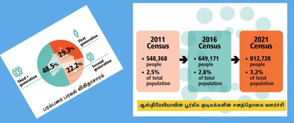 ஆஸ்திரேலியாவின் பூர்வீக குடிமக்களின் சனத்தொகை 2016 கணிப்புடன் ஒப்பிடுகையில் 25.2% அதிகரித்து இன்று 812,000 இலக்கை தொட்டு நிற்கிறது. மொத்த சனத்தொகையின் 3.2 சதவீதமே உள்ள இம்மண்ணின் மாந்தர்களின் அபிலாசைகளை பூர்த்தி செய்ய அடுத்தடுத்து ஆட்சி செய்த அரசாங்கங்கள் ஏன் தவறிவிட்டன என்ற கேள்விக்கு பதில் இல்லை என்பது உண்மையே.ஆஸ்திரேலியாவின் 51.5% பிரஜைகள் வேற்று நாட்டில் பிறந்தவர்களே. ஆஸ்திரேலியாவில் பிறந்தவர்களை அடுத்து இரண்டாம் இடத்தில் இருப்பவர்கள் பிரித்தானியாவை சேர்ந்தவர்கள் ஆகும். 2016ல் மூன்றாவது இடத்தில் இருந்த சீன நாட்டவர்களை புறம் தள்ளிவிட்டு இந்தியாவில் பிறந்தவர்கள் இக்கணிப்பில் மூன்றாவது இடத்தை இம்முறை பிடித்திருப்பது புதிய செய்தி! நான்காவது இடத்தில் சீனர்களும் அடுத்து நியூசிலாந்தில் இருந்து குடியேறியவர்களும் உள்ளனர்.2016 மற்றும் 2021 க்கு இடையில் நேபாளத்தை விட்டு வெளியேறும் மக்களின் எண்ணிக்கையும் அதிகரித்தது.