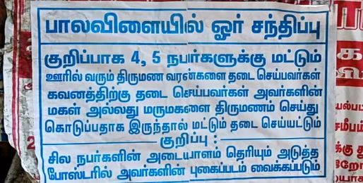 அதில், ‘திருமண வரன்களை தடை செய்பவர்கள் கவனத்திற்கு’ தடை செய்பவர்கள் அவர்களின் மகள் அல்லது மருமகளை திருமணம் செய்து கொடுப்பதாக இருந்தால் மட்டும் தடை செய்யட்டும்.