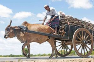 ஒரு மாட்டுவண்டில் வாகனங்களுக்கு முன்னால் நிற்கிறது. அந்த மாடு சிறுநீர் கழிக்கிறது. அதனால், வண்டில்காரன் நிறுத்தியிருக்கிறான்.