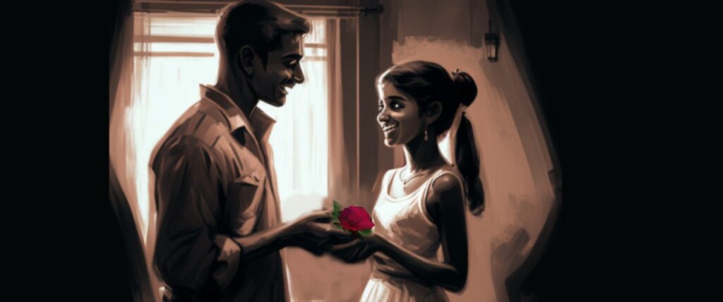 „ எனக்கு எதுவுமே புரியவில்லை,இப்படி நாங்கள் சாதுவாகக் கதைக்கத் தொடங்கிய இரண்டு மூன்று நாட்களின் பின்தான் ரோஜாப்பூவைக் கொண்டு வைக்க நான் அதிர்ச்சியுடன் திடுக்கிட்டு அவரைத் திரும்பிப் பார்க்க’ உங்கடை கலரும் ரோஜாப்பூவின் கலரும் ஒரே மாதிரி இருக்குது அழகான பெண்ணுக்கு ரோஜா இன்னும் அழகாக இருக்கும் „ என்றார்.
