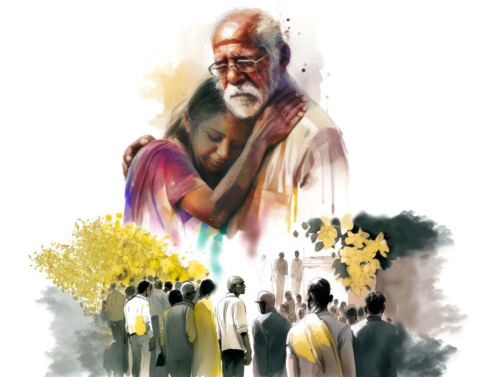 அப்பா, எனக்கு சொல்லிக் கொடுத்த சாருங்க, டீச்சருங்க வந்திருக்காங்க. பள்ளிக்கூடத்த லீவு விட்டுட்டு வந்திருக்காங்க. என்னோட தோழிங்களும் வந்திருக்காங்க. அப்பா, ப்ளீஸ்ப்பா. அவங்கள கூப்பிடுங்க. அம்மா மட்டும் கூப்பிட்டா பத்தாது. நீங்களும் கூப்பிடுங்க.