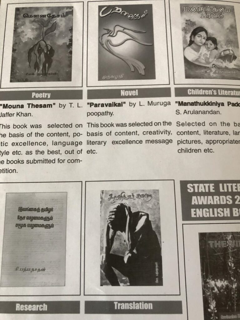 தமிழ்ப்பிரிவில் கலை, இலக்கியவாதிகள் கந்தையா ஶ்ரீகணேசன், அல் – அசூமத், ரி. எல். ஜபர்கான், எஸ். அருளானந்தன், பேராசிரியர் எஸ். பத்மநாதன், கவிஞர் எஸ். பத்மநாதன் ஆகியோருக்கு அன்று தேசிய சாகித்திய விருது தரப்பட்டது.