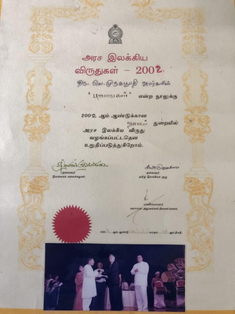 எனது பெயர் சொல்லப்பட்டபோது மேடைக்குச்சென்று பிரதமர் ரணில் விக்கிரமசிங்காவிடம் வெண்கலச்சிலையையும் சான்றிதழையும், காசோலையையும் வாங்கிக்கொண்டு இறங்கிவந்து சபையிலிருந்த அம்மாவிடம் கொடுத்தேன். அம்மாவுக்கு பூரிப்பு. சபையென்றும் பார்க்காமல் என்னை அணைத்து முத்தம் தந்தார்.