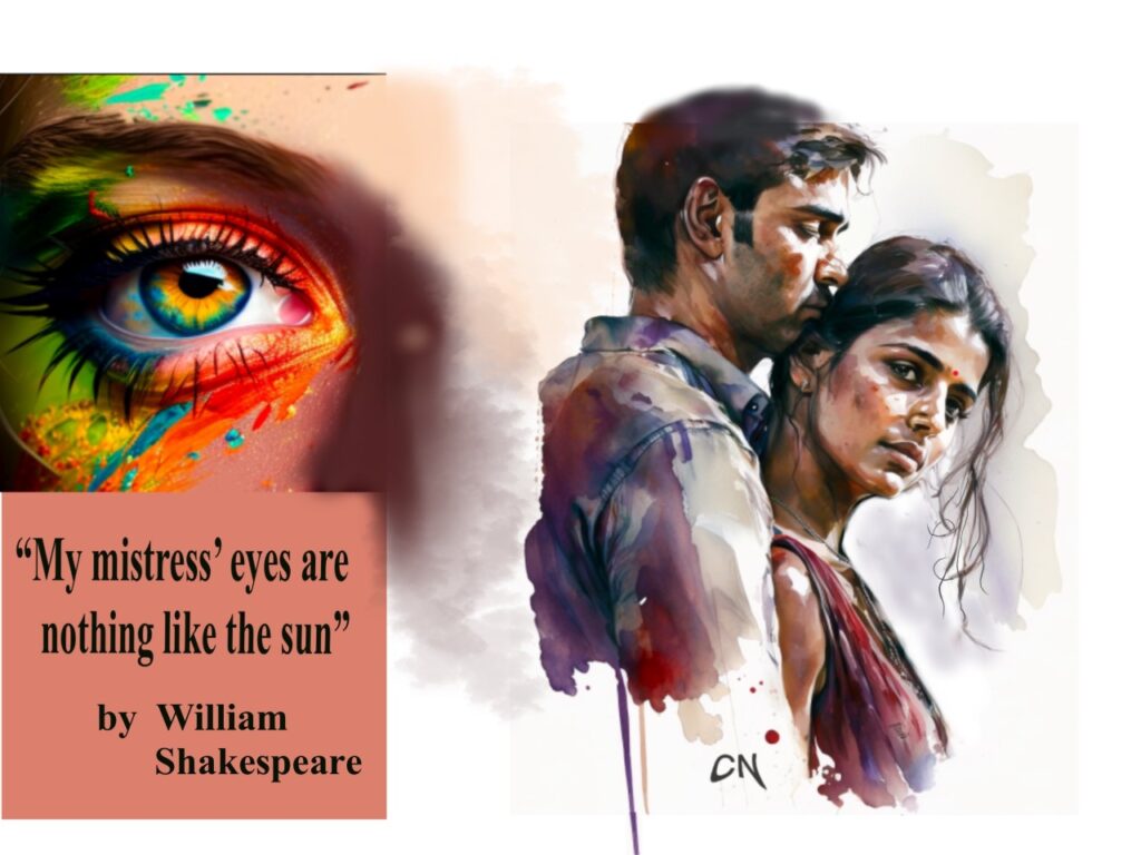 இது எல்லாம் எழுத்தாளர்களின் ஏமாத்துப் புருடா வேலை,இப்ப சேக்ஸ்பியர் ஆரோ பெண்ணை இரசித்து இரசித்து கவிதை எழுதிப் போட்டு „ எஜமானியின் கண்கள் சூரியனைப் போல இல்லையாம்,பவளம் எஜமானியின் சொண்டைவிடச் சிவப்பாம்.நல்லாய்க் கவனியுங்கோ சேக்ஸ்பியர் ஆரோ ஒரு பெண்ணின் கண்ணையும் சொண்டையும் இரசித்து காதலோடும் அதோடும் பார்த்திருக்கிறார்.