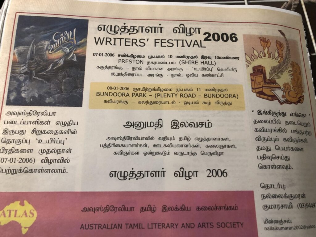 2006 ஜனவரி 7 ஆம் 8 ஆம் திகதிகளில் அவுஸ்திரேலியா மெல்பனில் நடந்த ஆறாவது எழுத்தாளர் விழாவின் நிகழ்ச்சிகள், விழா அமைப்பாளர்களின் நோக்கத்தை படிப்படியாக நிறைவேற்றிக் கொண்டிருக்கும் அறிகுறியை காண்பிக்கிறது.
