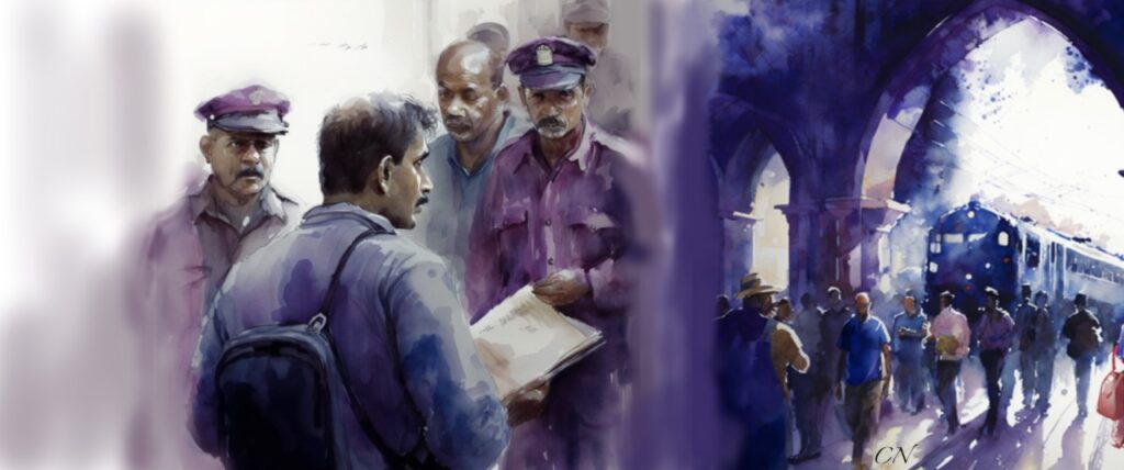 டீ, காபி ; டீ, காபி…. டீக்காரர் பாடத்தை மனனம் செய்வதைப் போல ஒப்பிக்கிறார். இடையிடையே இட்லி , பிரியாணி கூப்பாடுகள். பயணிகளின் கனிவான கவனத்திற்கு…. தமிழ், இந்தி ஆங்கிலத்தில் மாறி மாறி அறிவிப்புகள் ஒலித்தவண்ணம் இருந்தன. பயணிகள் எதையும் காதினில் வாங்கிக்கொள்ளவில்லை. ரயில் வரும் திசையை வைத்தகண் எடுக்காமல் பார்த்துக் கொண்டிருந்தார்கள்.