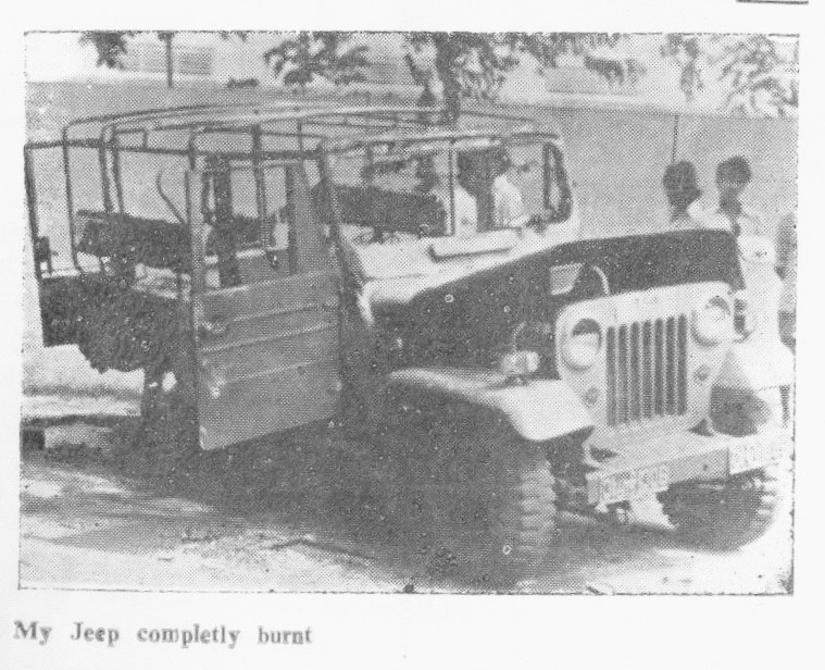 அரச படையினர் என் காருக்கும் தீ வைத்தனர். எனது வளாகத்தில் ஜீப் கேரேஜில் பத்திரமாக நிறுத்தப்பட்டு, கேரேஜ் பூட்டப்பட்டிருந்தது. கேரேஜில் இருந்து ஜீப்பை தள்ளிவிட்டு, ஜீப்பை இரும்பு கம்பியால் அடித்து, சாலையில் தள்ளி, பெட்ரோல் ஊற்றி தீ வைத்தனர். ஜீப் எரிந்து நாசமானது. அங்கே என் நண்பர் ஒருவர் நிறுத்தியிருந்த பியூஜியோ 404 கார் இருந்தது. அந்த காருக்கும் தீ வைத்தனர்.