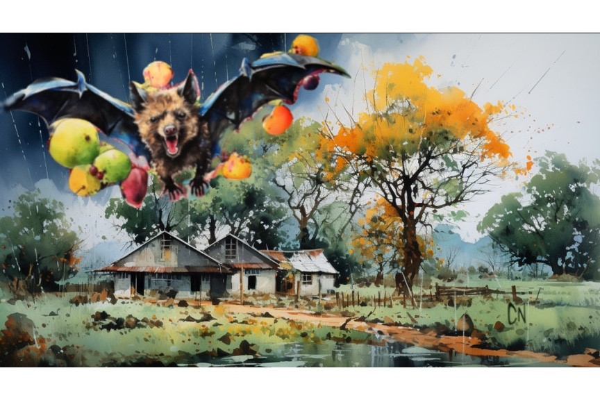 இரண்டு கனிதின்னும் வௌவால்கள் கொய்யா மரத்தின் கிளையில் தலைகீழாய் தொங்கியவாறு தனது இறக்கைகளை அடித்துக்கொண்டு கனியை உண்டு மகிழ்ந்தன. அவை உண்ண உண்ண வயிற்றின் மேல்நோக்கிச் சென்றது. பலநேரங்களில் வௌவால்கள் உண்ணுவதைப் பார்த்திருந்தாலும் அன்று ஏதோ புதிதாக பார்ப்பதுபோல் தோன்றியது.