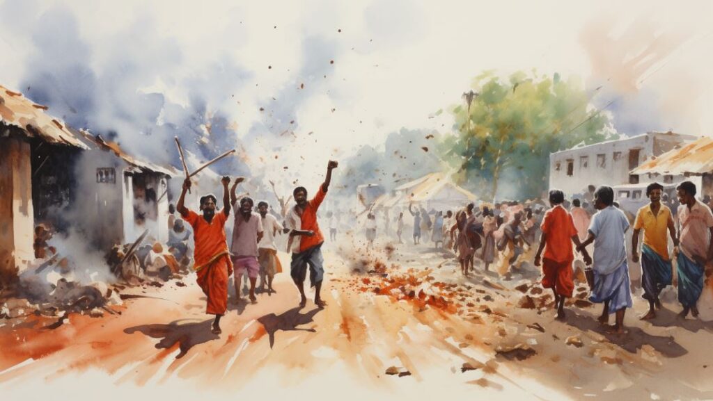 சாமக்கோழி கூவத் தொடங்கியது. மின் இணைப்பு துண்டிக்கப்பட்டு காரிருள் ஊரையே போர்த்திக்கொண்டு இருந்தது. மேலத்தெருவில் இருந்த வைக்கோல் போர்கள் ஆங்காங்கே கொழுந்து விட்டு எரியத் தொடங்கின. மேலத்தெரு மக்கள் வெளியில் ஓடி வந்து அலறிக்கொண்டு இருந்தனர். எந்தச் சலனமும் இல்லாமல் கீழத்தெரு அமைதியாக உறங்கிக்கொண்டிருந்தது.