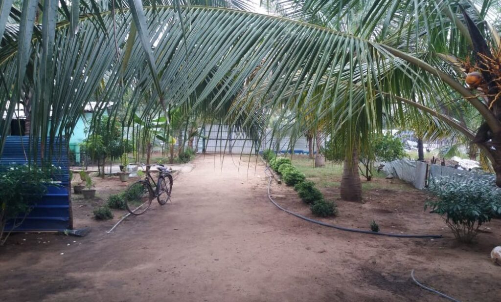 வீட்டைச் சுற்றி வளவு நிறையப் பூச்செடிகளும் மரக்கறிச்செடிகளும் வாழைமரங்களும் முருங்கை – எலுமிச்சை – தோடை – விழிமாங்காய் – நெல்லி – கொய்யா மரங்களும் மலிந்து பசுமையை வாரி இறைத்துக் கொண்டிருந்தன. வீட்டு முற்றத்து நடுவில் ‘கறுத்தக்கொழும்பான்’ மாமரமொன்று வீட்டுக் கூரைக்கு மேலாலும் உயர்ந்து வளர்ந்து கிளைபரப்பி நிழல் தந்து கொண்டிருந்தது.