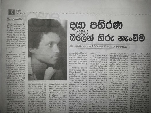 1986 ஆம் ஆண்டு டிசம்பர் 15 ஆம் நாள் அன்று, அவர் சோமசிறி என்ற சக மாணவருடன் பிலியந்தலை, போல்கொட ஏரிக்கு அப்பால் தனிமையான இடத்திற்கு கடத்தப்பட்டார். கடத்தல்காரர்கள் மாணவர் மற்றும் இடதுசாரி ஆர்வலர்கள் பற்றிய தகவல்களைக் கோரி அவரையும் சோமசிறியையும் சித்திரவதை செய்தனர்.