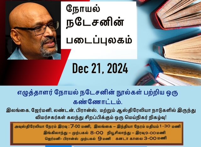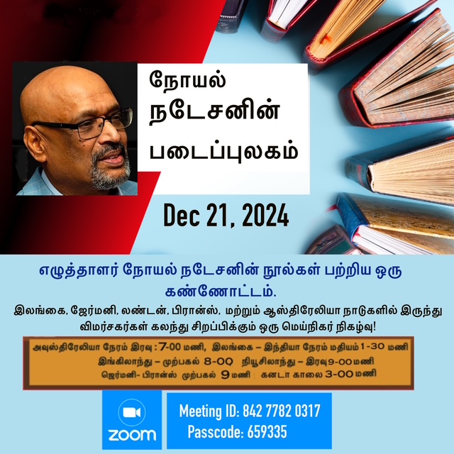 அவுஸ்திரேலியா – மெல்பனில் வதியும் எழுத்தாளரும் விலங்கு மருத்துவருமான நொயல் நடேசனின் பிறந்த தினத்தை முன்னிட்டு, அவரின் படைப்புலகம் தொடர்பான வாசிப்பு அனுபவப் பகிர்வு நிகழ்ச்சி இம்மாதம் 21 ஆம் திகதி ( 21-12-2024 ) சனிக்கிழமை மெய்நிகரில் ( Zoom Meeting ) நடைபெறும்.