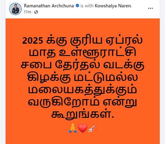 தற்போது உள்ளூராட்சிமன்றத் தேர்தலில் போட்டியிடுவது குறித்து அவரது அணியினர் ஆலோசித்துவரும் பின்புலத்தில், மலையகத்தில் போட்டியிடுவது குறித்து ஆலோசிக்கப்பட்டுள்ளதாக அவர் தமது பேஸ்புக் பக்கத்தில் கூறியுள்ளார்.
