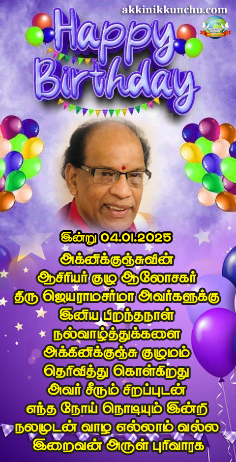 இன்று 04.01.2025 அக்னிக்குஞ்சுவின் ஆசிரியர் குழு ஆலோசகர் திரு ஜெயராமசர்மா அவர்களுக்கு இனிய பிறந்தநாள் நல்வாழ்த்துக்களை அக்கினிக்குஞ்சு குழுமம் தெரிவித்து கொள்கிறது அவர் சீரும் சிறப்புடன் எந்த நோய் நொடியும் இன்றி நலமுடன் வாழ எல்லாம் வல்ல இறைவன் அருள் புரிவாரக….