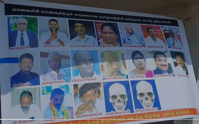 மறைந்த மாவை.சோ.சேனாதிராஜாவின் இறுதி நிகழ்வு கடந்த ஞாயிற்றுக்கிழமை இடம்பெற்ற தருணத்தில் அன்னாரது பூதவுடல் தகனம் செய்யப்பட்ட தச்சன்காடு இந்து மயானத்தில் தமிழ்த் தேசியத்தை நேசிக்கும் வடக்கு, கிழக்கு தமிழர்களின் சார்பில் ‘மாவையின் மரணத்திற்கு காரணமான தமிழினத்தின் தமிழரசுக் கட்சியின் துரோகிகள்’ என்னும் தலைப்பிடப்பட்ட பதாகை காட்சிப்படுத்தப்பட்டிருந்தது.