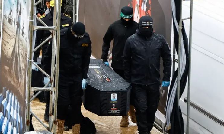தெற்கு காசாவில் உள்ள கான் யூனிஸில் சடலங்கள் ஒப்படைக்கப்படுவதற்கு முன்னதாக நூற்றுக்கணக்கான மக்கள் கூடியிருந்தனர். கருப்பு மற்றும் உருமறைப்பு சீருடையில் ஆயுதம் ஏந்திய ஹமாஸ் போராளிகள் அந்தப் பகுதிக்கு வந்திருந்தனர்.