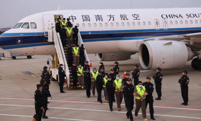 மியான்மரில் இருந்து மோசடி குற்றங்களில் ஈடுபட்டதாக சந்தேகிக்கப்படும் 200 சீன பிரஜைகளின் முதல் குழுவை திருப்பி அனுப்பும் பட்டய விமானம் தாய்லாந்து வழியாக கிழக்கு சீனாவின் ஜியாங்சு மாகாணத்தில் உள்ள நான்ஜிங்கில் வியாழக்கிழமை பிற்பகல் தரையிறங்கியது.