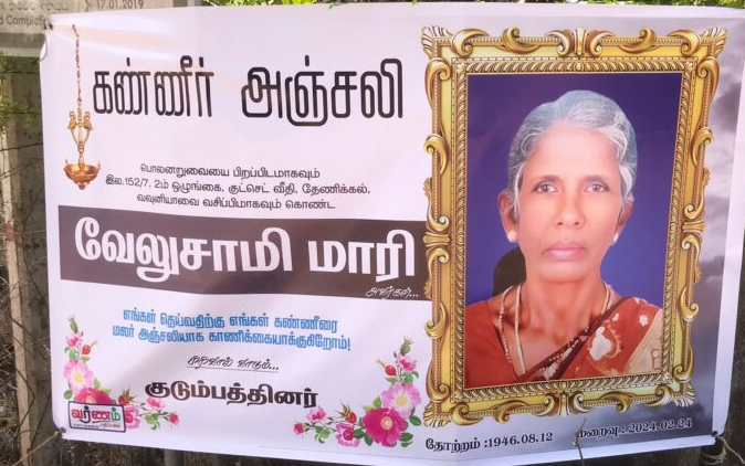 வவுனியா தோனிக்கல்லினை சேர்ந்த வேலுச்சாமி மாரி ( மாரி அம்மா) என்பவரே தனது 79வது வயதில் மரணமடைந்துள்ளார்.