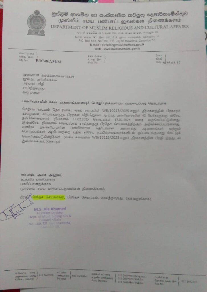 முஸ்லிம் சமய பண்பாட்டலுவல்கள் திணைக்கள உதவிப் பணிப்பாளர் எம்.எஸ். அலா அஹமட் ஒப்பமிட்டு அனுப்பியுள்ள அந்த கடிதத்தின் பிரதி சாய்ந்தமருது பிரதேச செயலாளருக்கும் அனுப்பி வைக்கப்பட்டுள்ளது. இந்த பள்ளிவாசலின் பெயர் சாய்ந்தமருது – மாளிகைக்காடு ஜும்ஆ பெரிய பள்ளிவாசல் என சட்டவிரோதமாக அழைக்கப்பட்டு வருவதும் குறிப்பிடத்தக்கது.