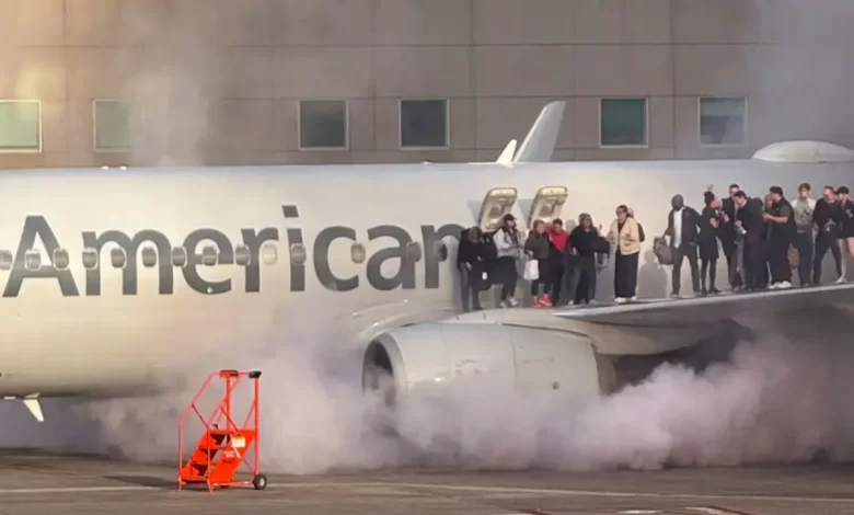 அமெரிக்கன் ஏர்லைன்ஸின் போயிங் 737-800 விமானத்தின் இயந்திரத்திலேயே தீ விபத்து ஏற்பட்டதால் கரும் புகைகள் விமான நிலையத்தை சூழ்ந்தன.