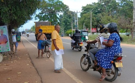 இதன்போது அவ் வீதியால் சென்ற மக்களுக்கும் துண்டுப்பிரசுரங்களை வழங்கி போராட்டத்தில் ஈடுபட்டிருந்தார்.