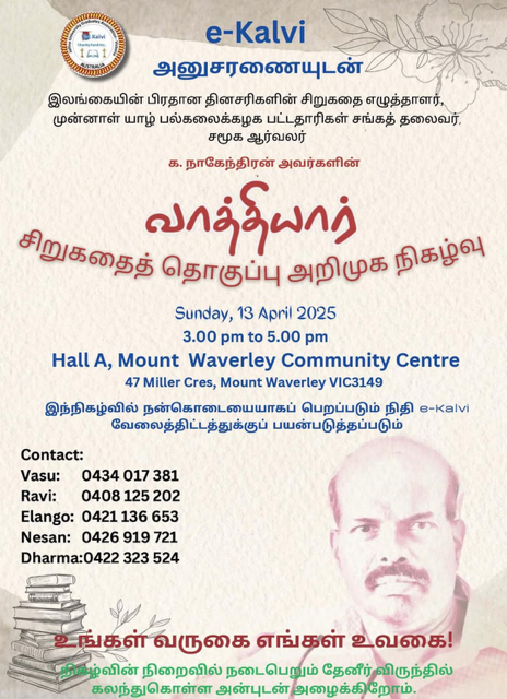 மெல்பேர்ணில் கந்தையா நாகேந்திரம் அவர்களின் சிறுகதை தொகுப்பான ‘வாத்தியார்’ எனும் நூல் ஞாயிற்றுக்கிழமை 13/4/25 மாலை 300 மணிக்கு மெல்பேர்ண், மவுண்ட் வேவளி சமூக மண்டபத்தில் ( mount waverley community centre hall) அறிமுக விழா நடைபெற உள்ளது.