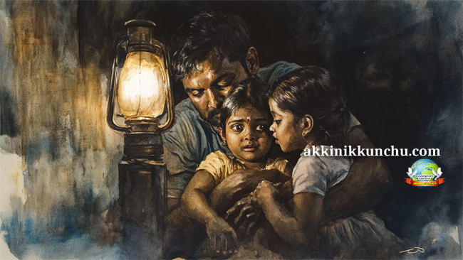 குழந்தைகள் தங்கராசின் மடியில் உறங்கிக் கொண்டு இருந்தனர். தங்கராசு மட்டும் வாசலை பார்த்தபடியே இருந்தார். சிம்னி விளக்கிலிருந்து ஒளி கிளம்பி வாசலுக்கும் பரவியது.