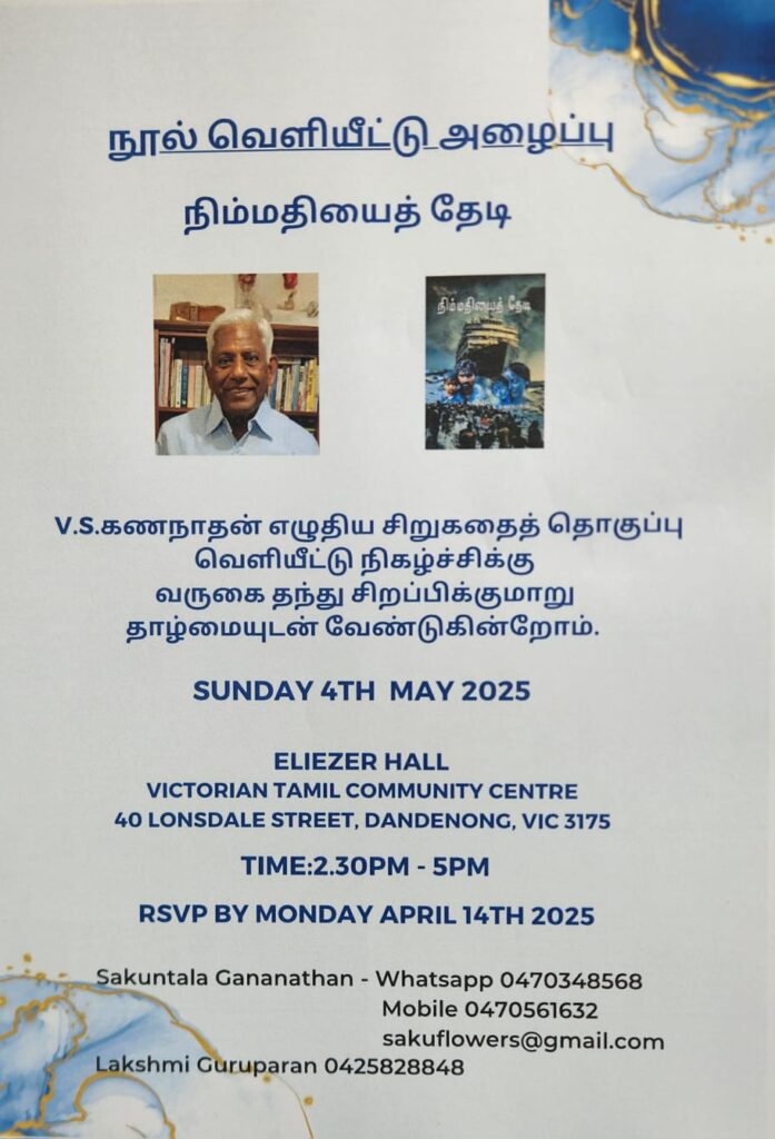 அவுஸ்திரேலிய தமிழ் இலக்கிய கலைச்சங்கத்தின் காப்பாளரும் எழுத்தாளருமான திரு. V.S. கணநாதன் அவர்களின் சிறுகதைத் தொகுப்பு நூல் “நிம்மதியைத் தேடி” வெளியீடு எதிர்வரும் ஞாயிறு மே மாதம் 4ம் திகதி மாலை 2.30 நடைபெறவுள்ளது.