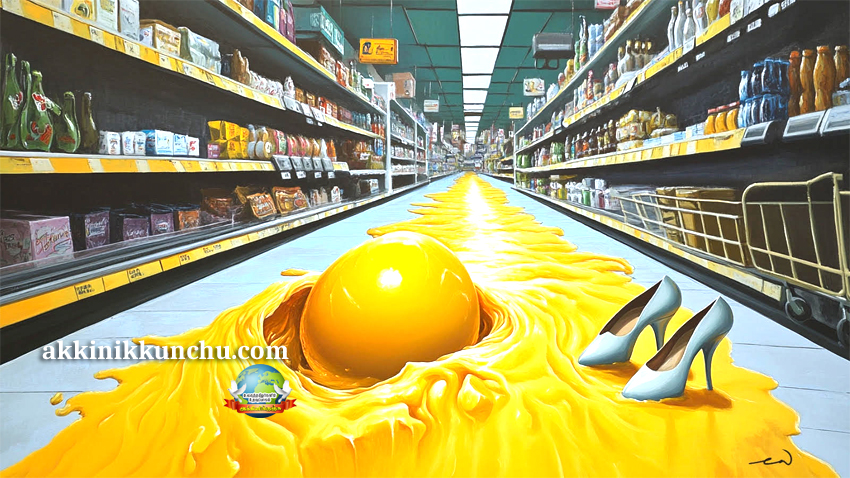 அவ்வாறு சமாளித்து நின்றாலும் அவளது கையிலிருந்த பையிலுள்ள பொருட்கள் நாலாபுறமும் விழுந்து சிதறியது. அப்படி விழுந்ததில் முட்டைகள் அடங்கிய பெட்டி திறந்து முட்டைகள் கீழே விழுந்ததில் சிதறி உடைந்தன. உடைந்த முட்டையிலுள்ள மஞ்சள் கரு தெறித்ததில் அவளது விலையுயர்ந்ந காலணி நாசமாயிற்று. கண்மூடி கண்திறக்கும் நேரத்தில் இவை யாவும் நடந்து முடிந்தன.
