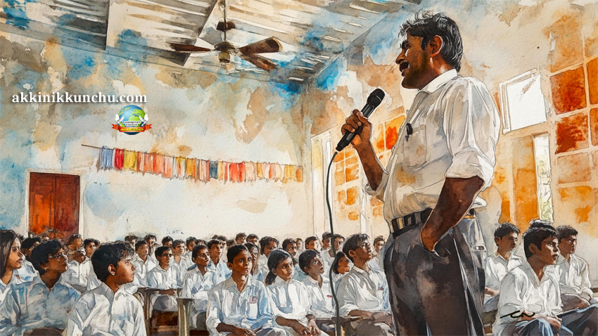 தட்ட தட்ட கைகள் சிவக்கட்டும்… கைகள் சிவக்க சிவக்க கர ஒலி விண்ணை பிளக்கட்டும்… சிறப்பு அழைப்பாளர்களுக்கு கைத்தட்டலை அன்பு பரிசாக வழங்குவோம் என நிகழ்ச்சி தொகுப்பாளர் சொன்னபொழுது மாணவர்களின் மனதில் உற்சாகம் பீறிட்டு கிளம்பியது. வாடி வாசலில் இருந்து வெளிவரும் காளைகளை அடக்குவதற்கு தயாராக இருக்கும் இளைஞர்களைப் போல் மாணவர்கள் நிகழ்ச்சியை எதிர்நோக்கிக் கொண்டிருந்தனர்.
