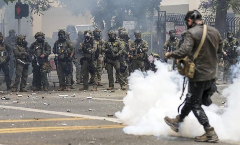 நேற்றைய தினம் இடம்பெற்ற போராட்டத்தின் போது தென்கிழக்கு லாஸ் ஏஞ்சல்ஸின் பாரமவுண்ட் பகுதியில் நூற்றுக்கணக்கான போராட்டக்காரர்களை பாதுகாப்புப் படையின்ர் எதிர்கொண்டனர்.