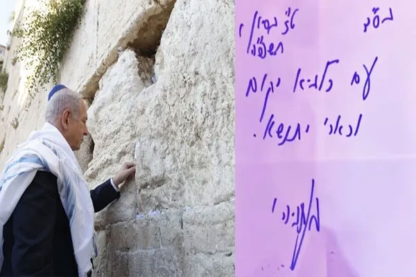 ஜெருசலேமில் உள்ள மேற்கு சுவர் யூதர்களுக்கு மிகவும் புனிதமான இடம். இங்கு பிரார்த்தனை செய்யும் யூதர்கள் குறிப்பு எழுதி சுவர் இடுக்கில் வைப்பது வழக்கம். அதன்படி பெஞ்சமின் நெதன்யாகு குறிப்பு ஒன்றையும் எழுதி மேற்கு சுவரின் இடுக்கில் வைத்தார்.