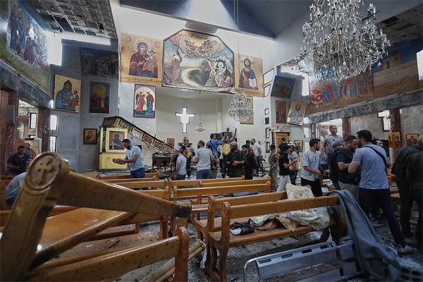 EPA People inspect damage following a suicide bomb attack at the Mar Elias Church in Dweila, a suburb of Damascus, Syria (22 June 2025)