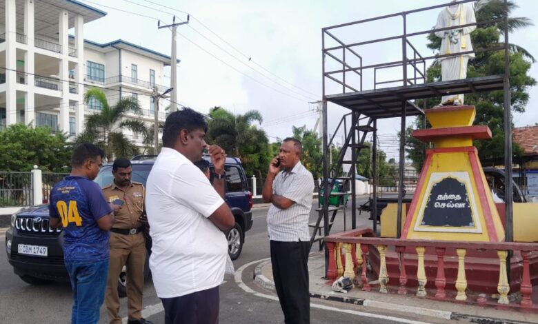 தந்தை செல்வாவின் உருவச் சிலையில் காணப்பட்ட அவரது தலை முழுமையாக அகற்றப்பட்ட நிலையில் அவரது சிலைக்கு அருகில் இருந்து தலைப்பாகம் மீட்கப்பட்டுள்ளது.
