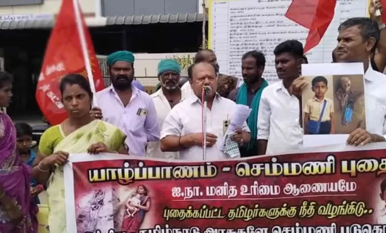 யாழ்ப்பாணம் – செம்மணி பகுதியில் தமிழர்கள் மீது நிகழ்த்தப்பட்ட கொலைகள் தொடர்பில் ஐக்கிய நாடுகள் மனித உரிமை ஆணையம் உரிய விசாரணை மேற்கொண்டு நடவடிக்கை எடுக்க வேண்டும் என வலியுறுத்தி நாம் தமிழர் கட்சியின் சார்பில், தமிழர் மக்கள் இயக்கம், தமிழ்த் தேசியப் பேரியக்கம் சார்பில்  கண்டன ஆர்ப்பாட்டம் ஒன்று நடைபெற்றது.